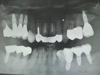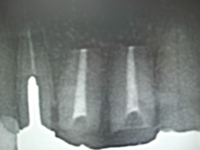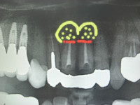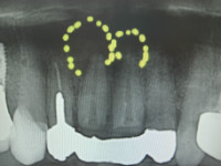 今日のオペは上顎左右1番の歯根端切除と骨補填です。この部位の根尖には歯冠大の歯根嚢胞があり、ずっと根管治療を行ってきたのですが、根尖からの排膿が消失せずなかなか良くならなかった為に、歯根嚢胞と感染した根尖部を根こそぎ除去してしまう歯根端切除術,及び骨補填する術式を選択することになった次第です。仮歯を装着して約半年後に補綴処置に移行していく予定です。 患者様のご希望により静脈鎮静下での施術といたしました。